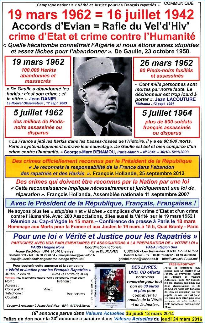 Même les publications qui sympathisent depuis 1954 avec le F.L.N. et condamnent les harkis « traitres » à la Patrie algérienne, se réjouissent de voir la France condamnée pour les mauvais traitements des harkis dans les camps. C’est hallucinant cette volonté, au rebours de leur sentiment anti Harkis, de se montrer participant de la victoire de nos camarades, nos frères d’armes.