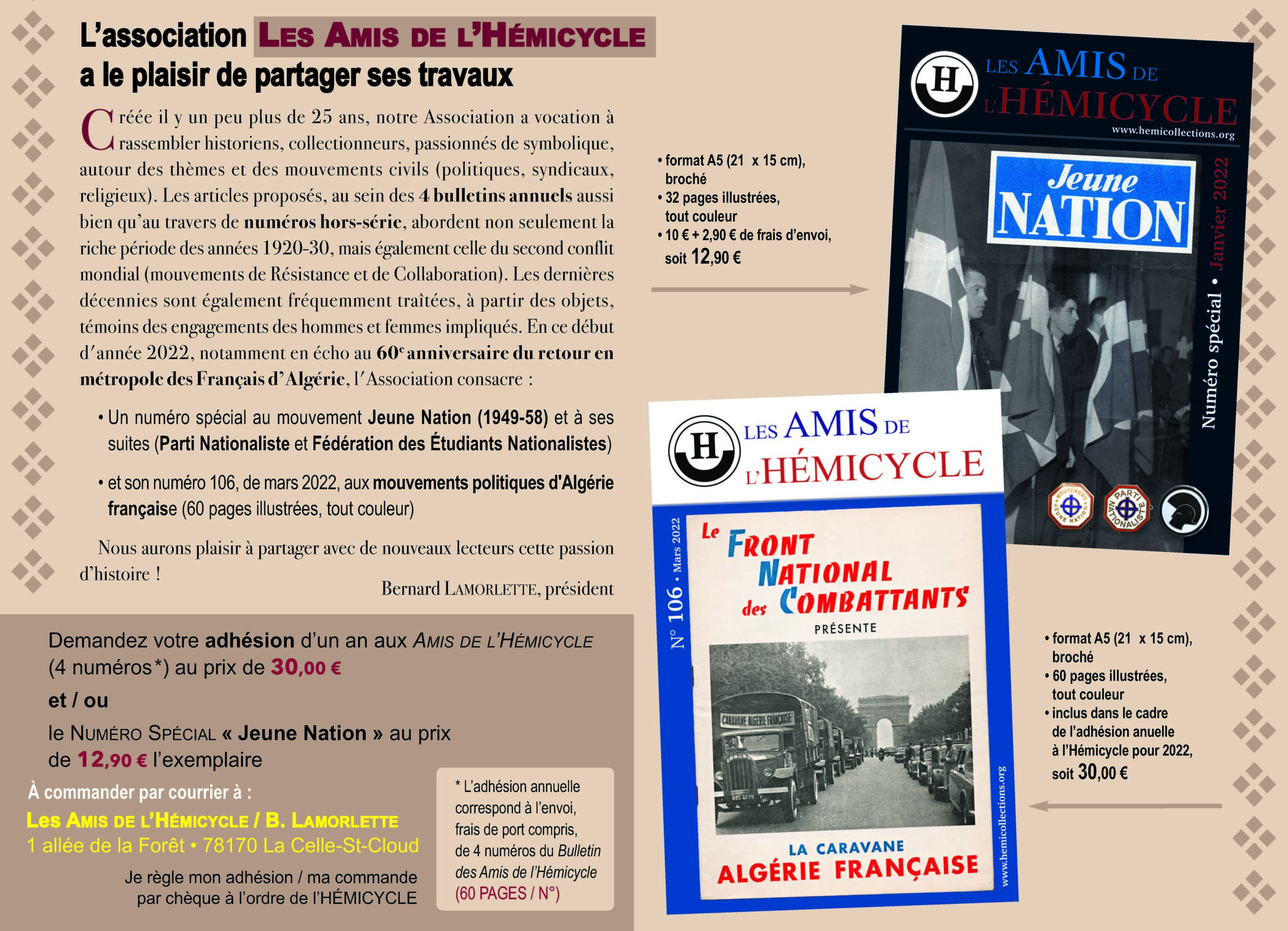 L’association l’Hémicycle( à laquelle j’appartiens par ailleurs) est une association qui rassemble collectionneurs, historiens et passionnés de tout ce qui touche aux mouvements politiques civils , elle a consacré plusieurs articles de fond tres intéressants aux mouvements Algérie Française avec une tres riche documentation provenant justement de collections privées.